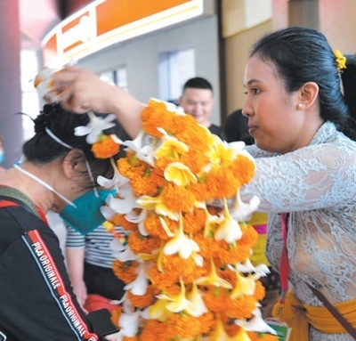 在印度尼西亞巴厘島伍拉萊國際機場,工作人員為中國游客佩戴迎賓花環(huán)。新華社記者 徐 欽攝