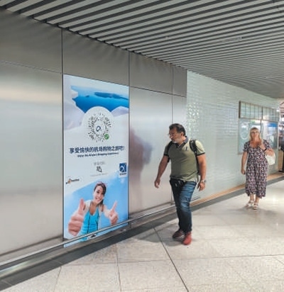 希臘雅典國際機場內(nèi),旅客走過用中文書寫的廣告海報。本報記者 謝亞宏攝