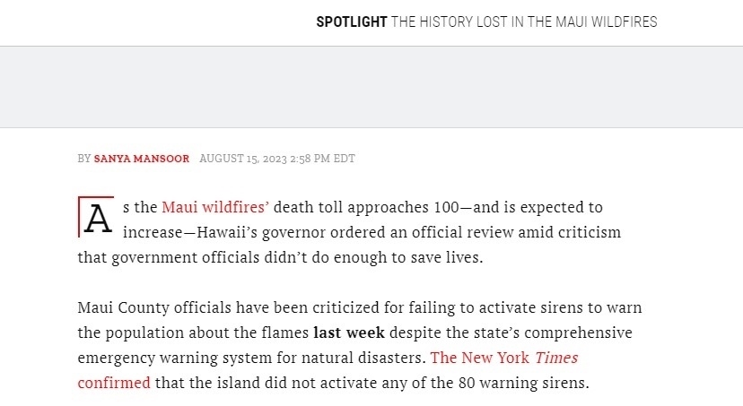 據(jù)悉,夏威夷毛伊島部署有80個警報器,但是在此次野火來襲過程中,警報器并未響起。安達亞16日曾表示,他并不后悔沒有拉響警報器,因為警報器通常是用來警示海嘯的,反而可能導致很多民眾逃向內陸地勢較高處,從而進入火海。這一表態(tài)激起了廣泛爭議和批評。