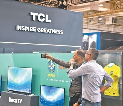 在2023年圣保羅國際消費類電子及家用電器產品展覽會上,參觀者在TCL展臺前合影留念。本報記者 時元皓攝