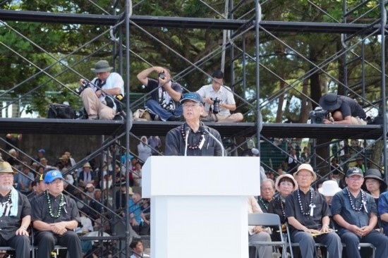 2016年6月19日,在日本沖繩縣首府那霸市一座公園內(nèi),時(shí)任沖繩縣知事翁長(zhǎng)雄志(前)發(fā)表講話。新華社記者沈紅輝攝