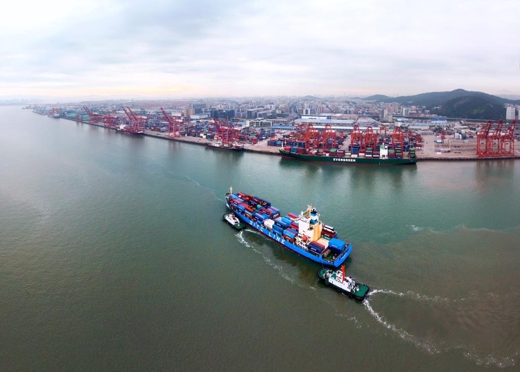 在福建自貿(mào)區(qū)廈門(mén)片區(qū)東渡港區(qū),一艘貨輪向碼頭靠攏(2017年8月26日無(wú)人機(jī)照片)。(新華社記者姜克紅攝)