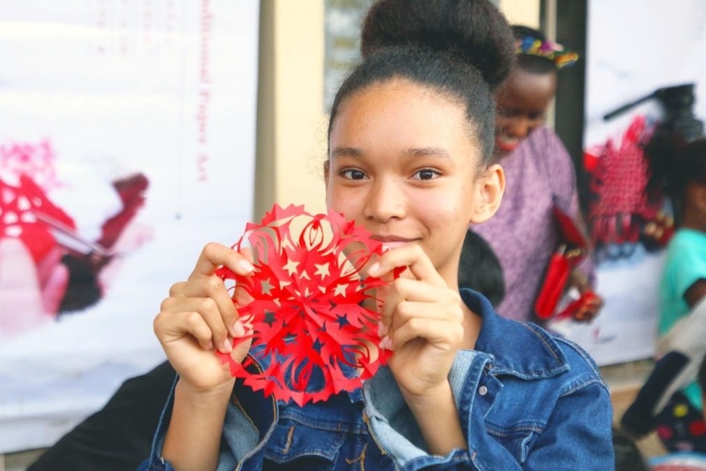 9月23日,盧旺達首都基加利,在盧旺達大學(xué)孔子學(xué)院舉辦的“中國文化進校園”暨中秋國慶慶?;顒蝇F(xiàn)場,一名女孩展示剪紙成果。(新華社發(fā),黃萬晴攝)