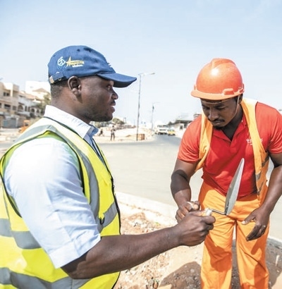 ?塞內(nèi)加爾達(dá)喀爾快速公交項(xiàng)目是塞內(nèi)加爾第一條城市快速公交線路。這條長(zhǎng)約18公里的道路將穿過(guò)達(dá)喀爾人口密度最高的社區(qū)和核心商務(wù)區(qū),建成后有助于緩解首都交通壓力。圖為當(dāng)?shù)貑T工在項(xiàng)目建設(shè)工地交流。新華社記者 李亞輝攝