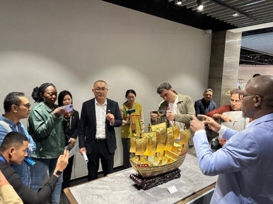 嘉賓在中國工藝集團(tuán)體驗景泰藍(lán)制作過程 (新華社記者王艷剛攝)