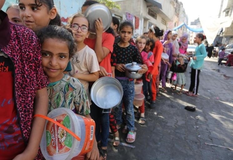 11月9日,在加沙地帶南部城市拉法,人們在一個臨時分發(fā)點排隊領(lǐng)取食物。新華社發(fā)(哈立德·奧馬爾攝)