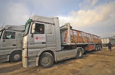 12月17日,載有中國援助的人道主義物資的貨車抵達(dá)凱雷姆沙洛姆口岸加沙地帶一側(cè)。亞西爾·庫迪攝(新華社發(fā))
