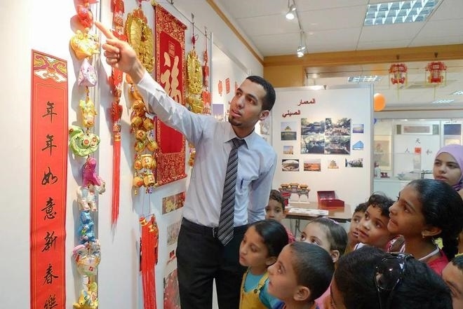 一位埃及青年正認(rèn)真向圍在身邊的學(xué)生們講解中國(guó)傳統(tǒng)文化中的十二生肖。他身穿白色襯衫,系著條紋領(lǐng)帶,學(xué)生們仰起頭,專心致志地聆聽講解。這位埃及青年便是時(shí)年28歲的阿巴斯。作為開羅中國(guó)文化中心主任助理,他經(jīng)常在這里向埃及學(xué)生和民眾介紹中國(guó)的文房四寶和京劇臉譜,講解中國(guó)的傳統(tǒng)節(jié)日和風(fēng)景名勝,并帶領(lǐng)孩子們做手工,燈籠、風(fēng)箏和寫對(duì)聯(lián)往往是他們最喜愛的內(nèi)容。在當(dāng)年埃及的動(dòng)蕩時(shí)局下,中國(guó)文化中心照常對(duì)外開放,各種活動(dòng)有序開展。首屆大使杯“魅力埃及,多彩中國(guó)”攝影大賽作品展就吸引了上百名開羅市民前往參觀。