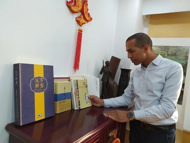 阿巴斯向記者介紹中國(guó)文化相關(guān)書籍。黃培昭攝