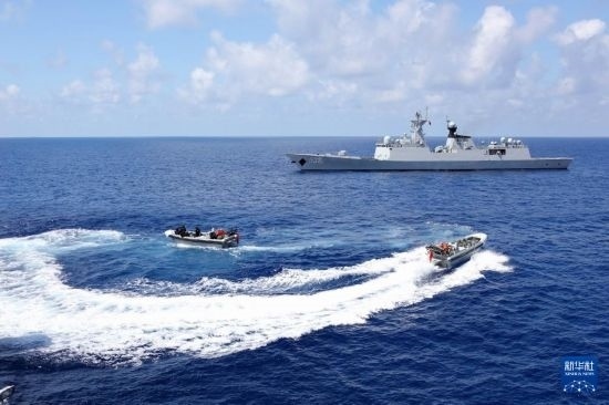 中國(guó)海軍第45批護(hù)航編隊(duì)烏魯木齊艦、東平湖艦為中國(guó)漁船護(hù)航(2023年10月20日攝)。新華社發(fā)(王遠(yuǎn)方攝)