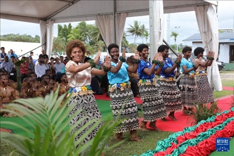 1月12日,表演者在斐濟蘇瓦的活動現(xiàn)場跳傳統(tǒng)舞蹈。新華社發(fā)(桑欽龍攝)