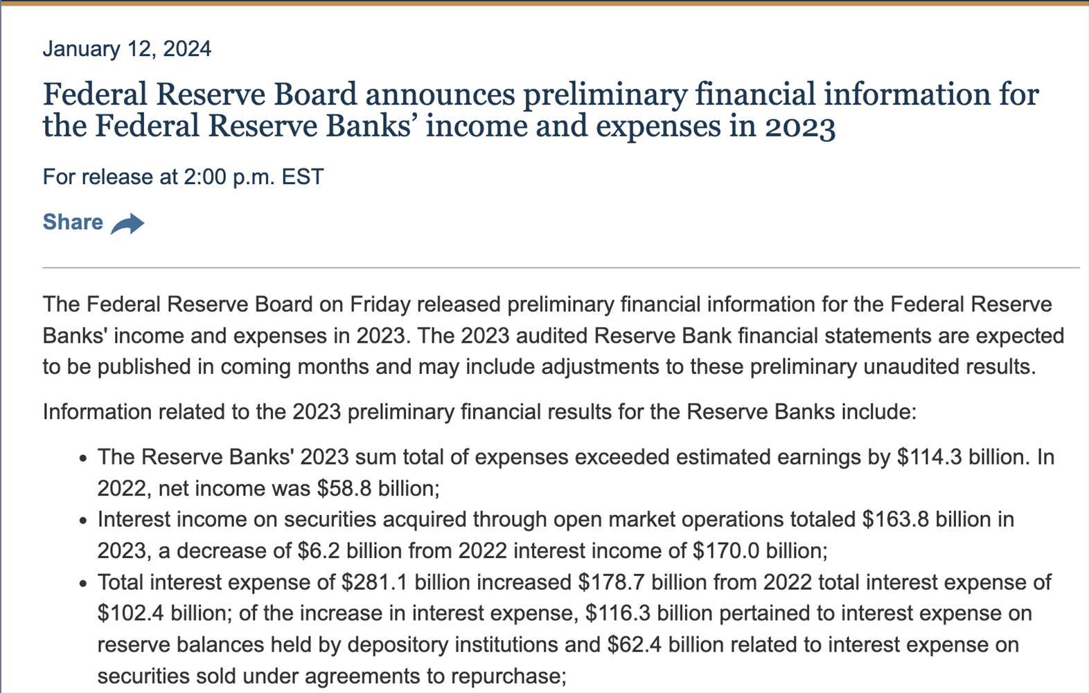 美聯(lián)儲發(fā)布的2023年收入和支出的初步財務(wù)信息。圖片來自美聯(lián)儲官網(wǎng)