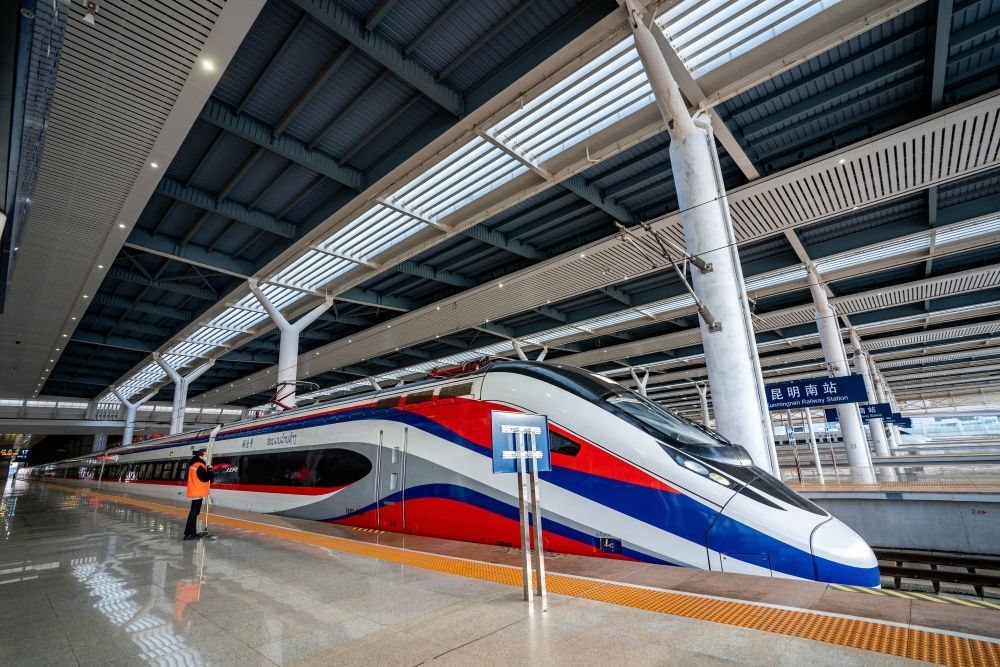 2月14日,中老鐵路國際旅客列車在昆明南站即將發(fā)車。
