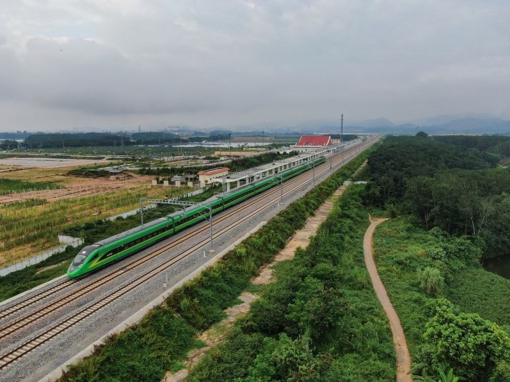 2023年10月22日,動車從位于云南省景洪市勐罕鎮(zhèn)的中老鐵路橄欖壩站駛出(無人機照片)。