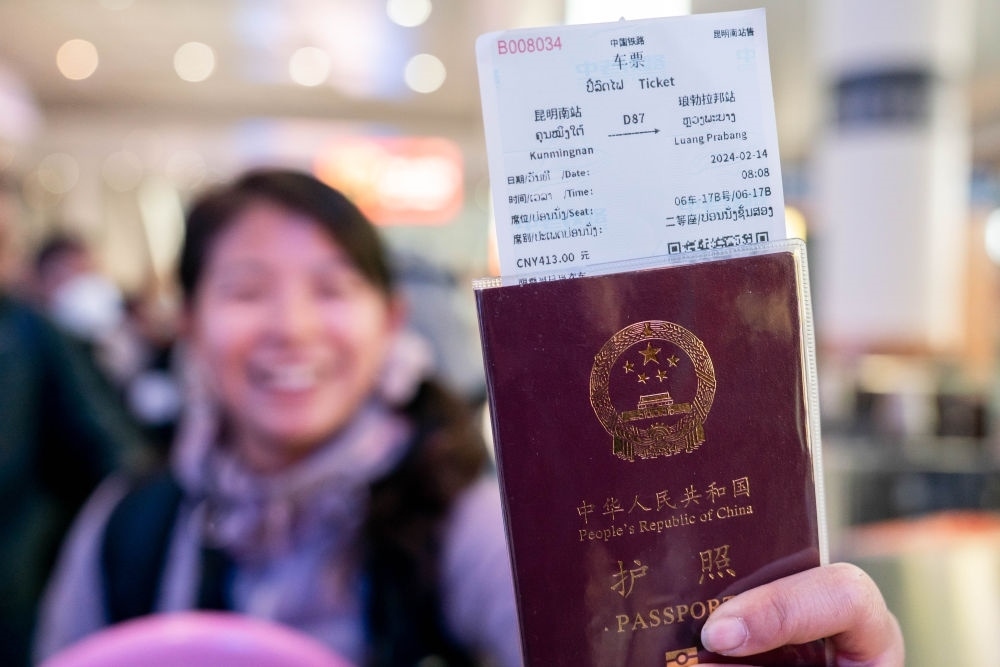 2月14日,游客在昆明南站乘坐中老鐵路國際旅客列車準備前往老撾旅游。
