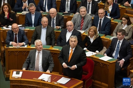 2月26日,匈牙利總理歐爾班(前右)在布達(dá)佩斯舉行的國會春季會議上致辭。新華社發(fā)(弗爾季·奧蒂洛攝)
