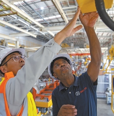 中國(guó)和南非兩國(guó)員工在南非東開普省北汽南非工廠焊裝車間內(nèi)工作。新華社記者 張譽(yù)東攝