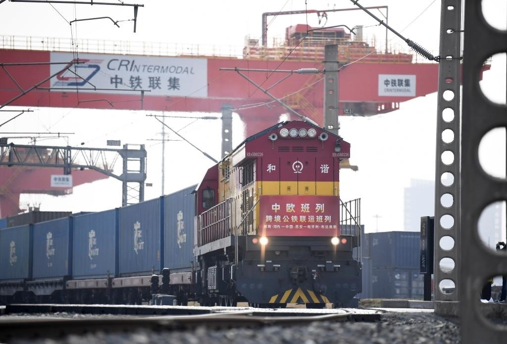 ?3月7日,中歐班列(越南·河內(nèi)——中國·西安——匈牙利·布達(dá)佩斯)跨境公鐵聯(lián)運班列從西安國際港站駛出。新華社記者李一博攝