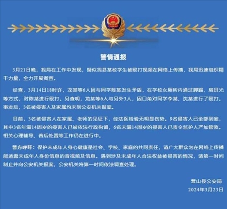 ·四川營(yíng)山通報(bào)一女生遭同學(xué)毆打:9名侵害人全部到案。