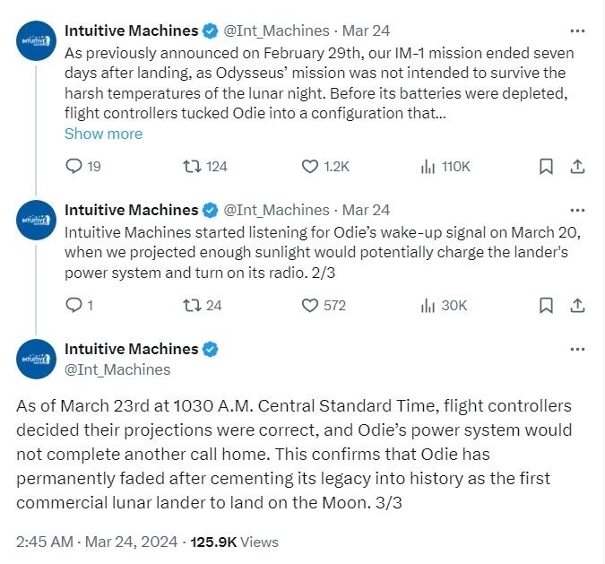 “經(jīng)過數(shù)天等待,已確認‘奧德修斯’電力系統(tǒng)已不能支持它再次完成通信,”聲明寫道。“這證實‘奧德修斯’作為首個由私營企業(yè)發(fā)射的月球著陸器永久休眠。”