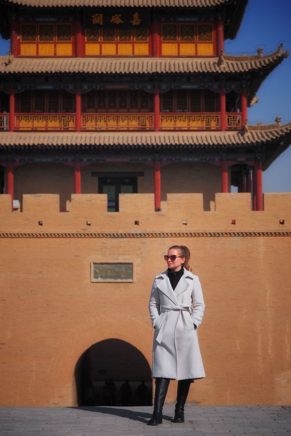 3月14日,新華社外籍記者達莎在甘肅嘉峪關(guān)城樓前。新華社記者趙宇攝