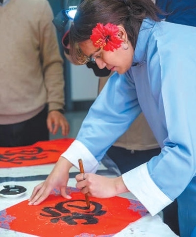安雅在學(xué)校為留學(xué)生舉辦的新春活動(dòng)上用毛筆書(shū)寫(xiě)“?!弊?。受訪者供圖