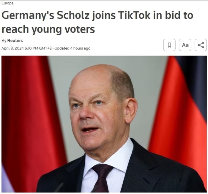 報(bào)道稱,朔爾茨加入TikTok是為吸引年輕選民。兩個(gè)月前,美國(guó)總統(tǒng)拜登也正式加入了TikTok。