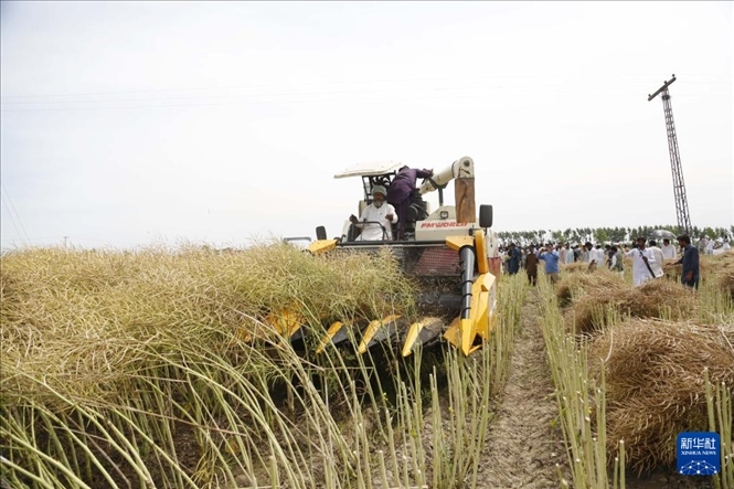 4月17日,一臺從中國引進的油菜籽收割機在巴基斯坦東部旁遮普省珀格爾地區(qū)一處農(nóng)田進行收割作業(yè)。新華社發(fā)(艾哈邁德·卡邁勒攝)