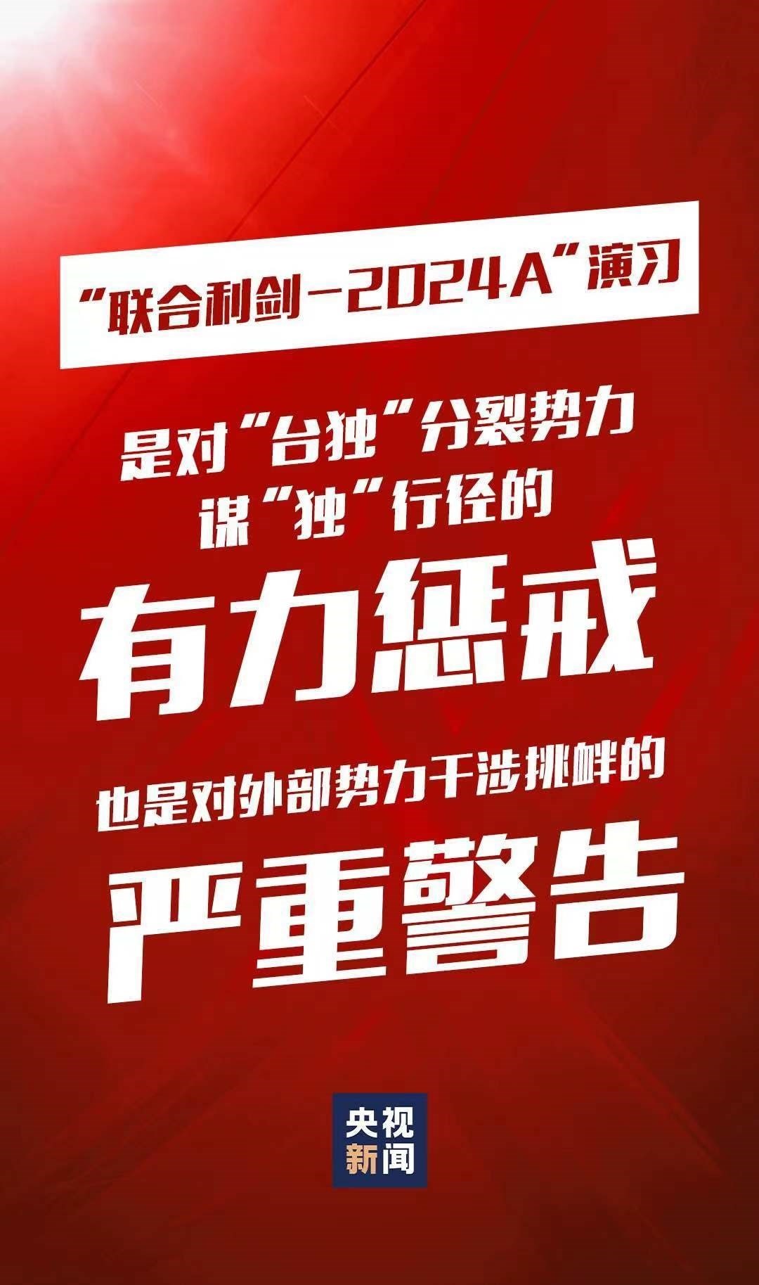 5月23日至24日,中國人民解放軍東部戰(zhàn)區(qū)組織戰(zhàn)區(qū)陸軍、海軍、空軍、火箭軍等兵力,位臺島周邊開展“聯(lián)合利劍-2024A”演習,重點演練聯(lián)合??諔?zhàn)備警巡、聯(lián)合奪取戰(zhàn)場綜合控制權(quán)、聯(lián)合精打要害目標等科目,艦機抵近臺島周邊戰(zhàn)巡,島鏈內(nèi)外一體聯(lián)動,檢驗戰(zhàn)區(qū)部隊聯(lián)合作戰(zhàn)實戰(zhàn)能力。這是中國維護國家主權(quán)和領(lǐng)土完整的正義之舉,也是對“臺獨”分裂勢力謀“獨”行徑的有力懲戒,對外部勢力干涉挑釁的嚴重警告。