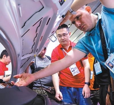 一名外國采購商在第135屆廣交會(huì)新能源汽車展區(qū)詳細(xì)了解一款車型。新華社記者 劉大偉攝