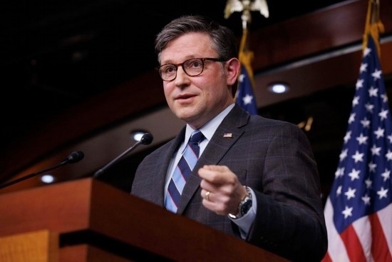 2月6日,在美國華盛頓,美國國會(huì)眾議院議長邁克·約翰遜舉行記者會(huì)。新華社發(fā)(亞倫攝)