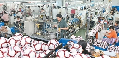湖南省邵陽市洞口縣工業(yè)園區(qū),金美達(dá)體育用品有限公司員工在生產(chǎn)足球,趕制出口訂單產(chǎn)品。滕治中攝(人民視覺)