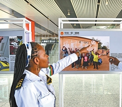 3月22日,在肯尼亞首都內羅畢,當地人在蒙內鐵路內羅畢火車站參觀中非共建“一帶一路”務實合作圖片展。新華社記者 韓 旭攝