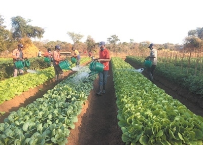 剛果(金)農業(yè)種植培訓示范基地的當地學員在為蔬菜澆水。北方礦業(yè)拉米卡公司供圖