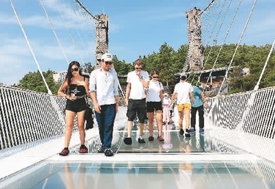 | 外國游客在湖南張家界大峽谷景區(qū)玻璃橋上參觀游覽。吳勇兵攝(人民圖片) |