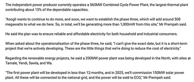 深能安所固投資建設(shè)運(yùn)營的聯(lián)合循環(huán)發(fā)電廠裝機(jī)容量560兆瓦,并計(jì)劃在未來通過擴(kuò)建工程提升至超1000兆瓦,為當(dāng)?shù)丶彝ズ凸I(yè)消費(fèi)者提供可靠且負(fù)擔(dān)得起的電力供應(yīng)。加中兩國員工在電廠運(yùn)營中密切合作,新入職的加納員工會(huì)配有一名中國導(dǎo)師,還可以通過參加培訓(xùn)提升職業(yè)技能?!约蛹{通訊社報(bào)道