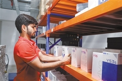 中國企業(yè)位于巴基斯坦的海外倉將中國制造的數(shù)碼產(chǎn)品等高附加值貨物快速配送至本地線下零售商網(wǎng)絡(luò),顯著提升效率和靈活性。圖為海外倉的送貨員正在與當(dāng)?shù)厣虘艚唤迂浳?。本?bào)巴基斯坦分社 賽義德·邁赫迪攝