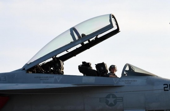 2017年7月22日,在美國弗吉尼亞州諾??撕\娀?,飛行員坐在“福特”號航母上的F/A-18戰(zhàn)斗機(jī)中。新華社記者殷博古攝