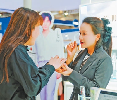 第七屆進博會期間,參觀者在花王展臺體驗相關(guān)產(chǎn)品。