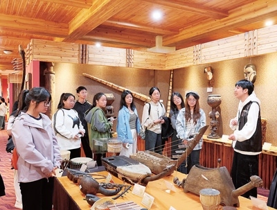 非洲博物館志愿者(右一)向觀眾介紹館內(nèi)藏品。