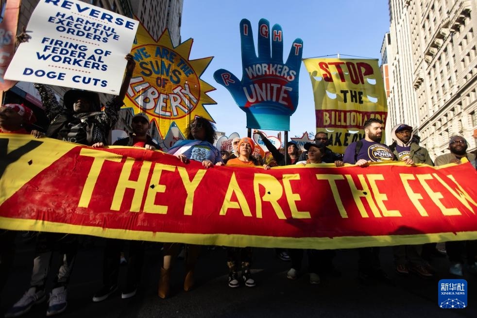 5月1日,人們手持標(biāo)語在美國紐約參加抗議特朗普政府政策的集會(huì)和游行。新華社發(fā)(郭克攝)