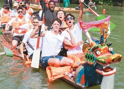 去年,我參加了由杭州余杭區(qū)五常街道組織的龍舟體驗(yàn)營(yíng),親身感受競(jìng)渡帶來(lái)的“速度與激情”。我和同校好友組成隊(duì)伍,伴著耳邊觀眾的熱情歡呼揮槳出發(fā),濺起的水花在河道綻放。握槳、入水、拉水、出水、回槳……隨著龍舟劃至終點(diǎn),我們揮舞校旗、舉槳?dú)g呼。在龍舟運(yùn)動(dòng)中,我感受到了奮斗和團(tuán)結(jié)的力量——不同膚色的人們?cè)谕粭l水道上并肩奮進(jìn),這不正是“同舟共濟(jì)”的東方智慧嗎!