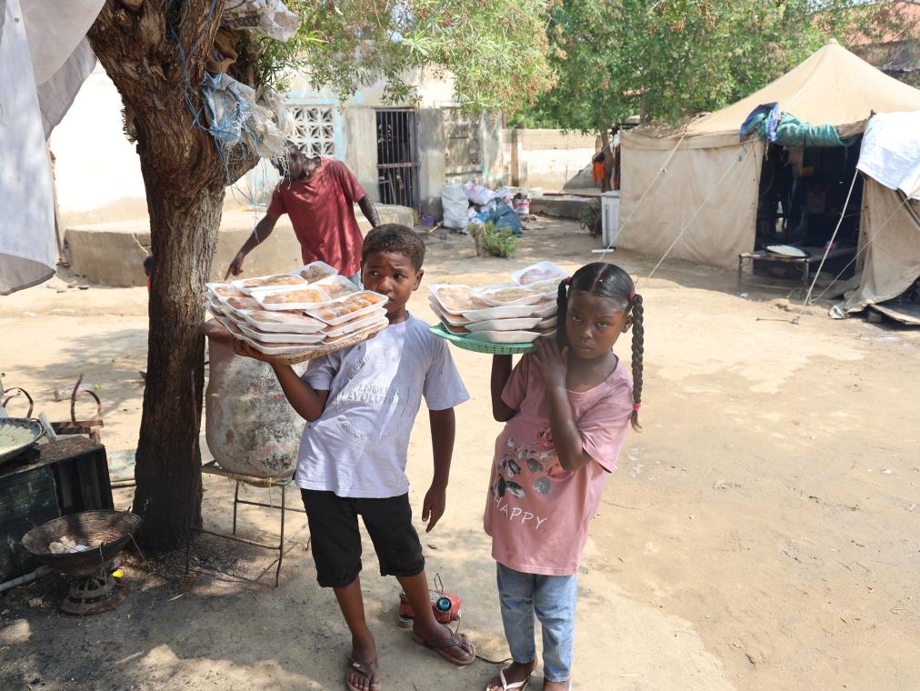 2024年11月12日,在蘇丹東部城市蘇丹港的一處流離失所者營(yíng)地,兩名兒童準(zhǔn)備把制作好的食品拿到市場(chǎng)出售以換取收入。新華社發(fā)(法耶茲·扎基攝)