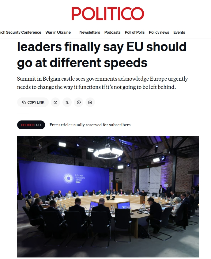 《政治報》網(wǎng)站歐洲版的報道評論稱,歐盟一直以其成員國團結(jié)一致向前邁進而自豪,那個時代已經(jīng)結(jié)束了。2月12日在比利時舉行的會議上,法國、德國、意大利等多國領(lǐng)導(dǎo)人支持,最早將于下個月的歐洲理事會上形成一項計劃,以簽署組成更小團體的倡議。各國政府表示,由于歐洲的許多想法陷入優(yōu)柔寡斷和不和諧之中,歐洲的競爭優(yōu)勢正在逐漸消失,因此他們感到一種緊迫感。