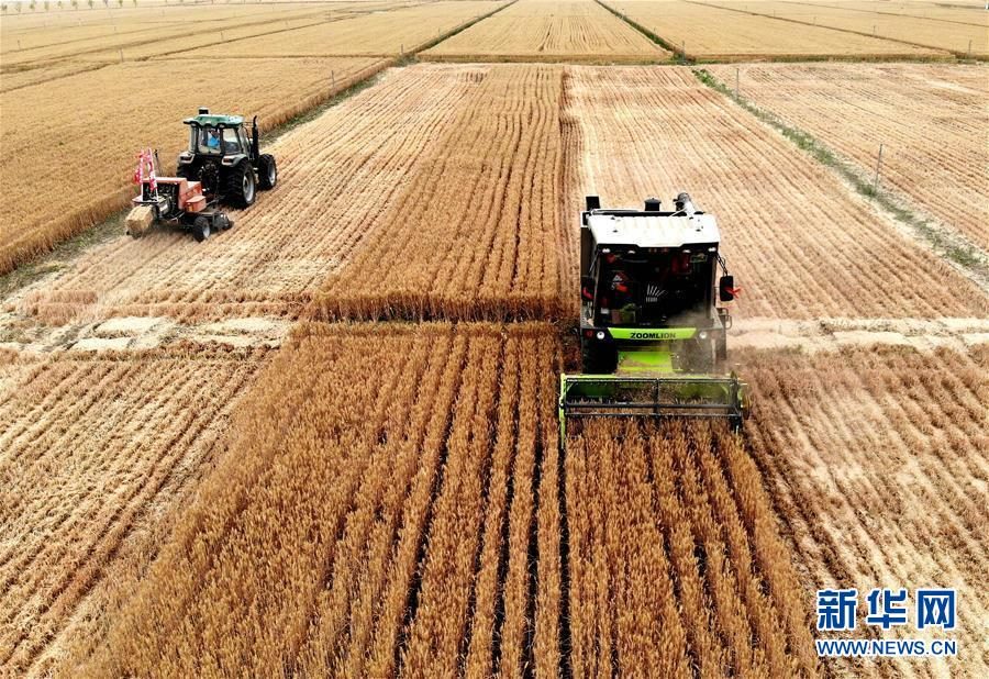 5月29日,在河南省商水縣南陵村的一處麥田里,農(nóng)機(jī)手操作收割機(jī)和小麥秸稈打捆機(jī)(無人機(jī)照片)。眼下,“中原糧倉”河南迎來豐收季,各地農(nóng)民搶抓農(nóng)時(shí)收割小麥。截至5月29日17時(shí),全省已收獲小麥3315萬畝,日投入聯(lián)合收割機(jī)7.8萬臺。新華社記者李安攝
