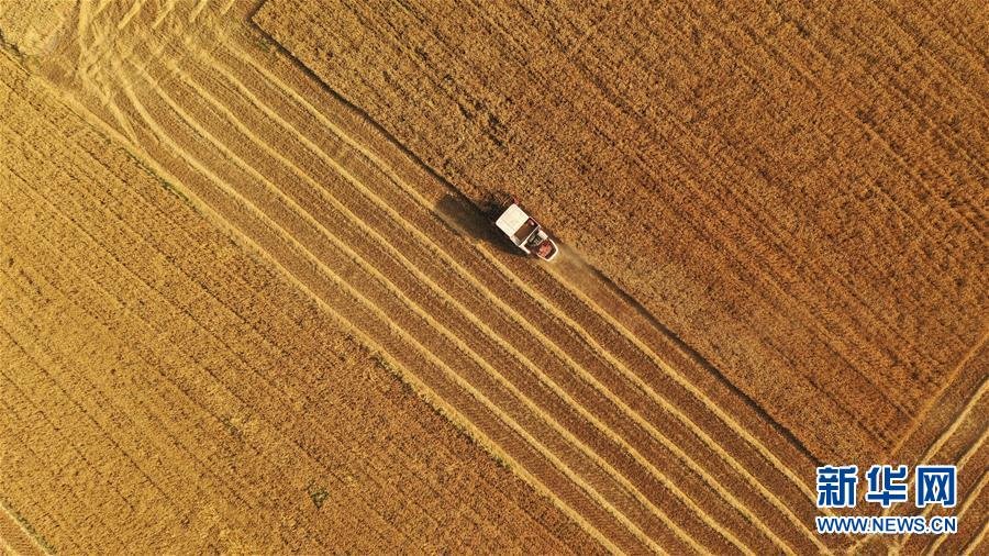 6月2日,在合肥市蜀山區(qū)小廟鎮(zhèn)馬崗村,農(nóng)機(jī)手操作機(jī)械設(shè)備收割小麥(無人機(jī)照片)。 “三夏”時(shí)節(jié),安徽各地麥?zhǔn)者M(jìn)入高峰期,農(nóng)民搶收小麥,確保顆粒歸倉。新華社記者劉軍喜攝