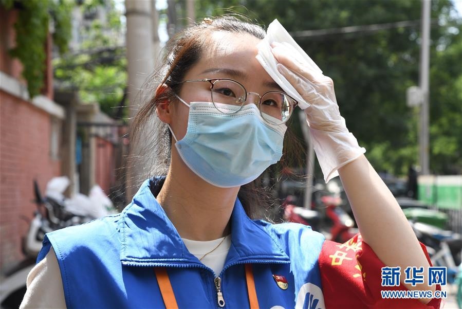 6月16日,在北京市海淀區(qū)中關(guān)村街道白塔庵社區(qū)出入口,疫情防控志愿者王玥在擦拭汗水。連日來,北京出現(xiàn)高溫天氣??崾钪校ぷ魅藛T堅守抗擊疫情一線,成為烈日下的“逆行者”。新華社記者任超攝