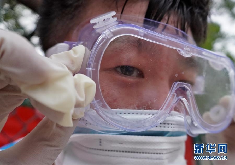 豐臺區(qū)東高地街道社區(qū)衛(wèi)生服務(wù)中心一位醫(yī)護人員的護目鏡內(nèi)流進了汗水(6月15日攝)。連日來,北京出現(xiàn)高溫天氣??崾钪?,工作人員堅守抗擊疫情一線,成為烈日下的“逆行者”。新華社記者李欣攝