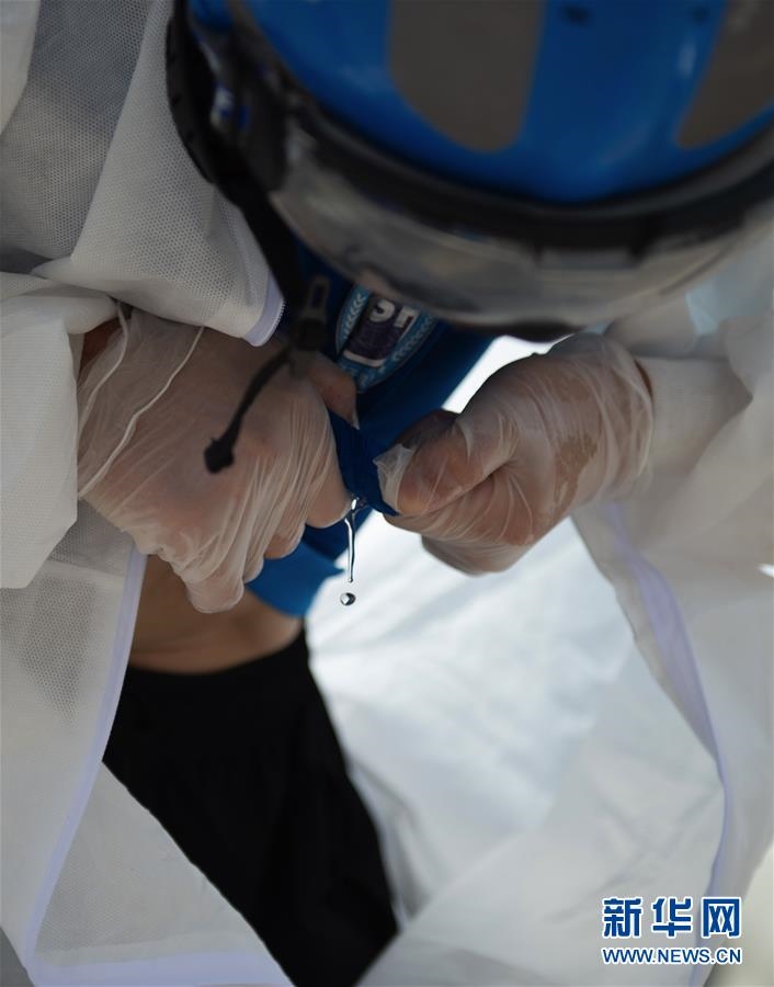 6月16日,北京藍天救援隊完成消殺任務(wù)后,一位隊員的衣服被擰出了汗水。連日來,北京出現(xiàn)高溫天氣。酷暑中,工作人員堅守抗擊疫情一線,成為烈日下的“逆行者”。新華社發(fā)(陳鐘昊攝)