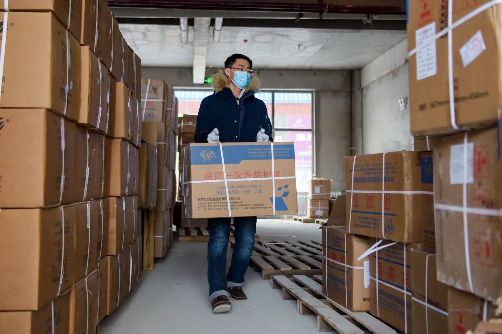 在位于滿(mǎn)洲里市臚臏社區(qū)的臨時(shí)物資存放點(diǎn),工作人員在搬運(yùn)防疫物資。新華社記者 李志鵬 攝